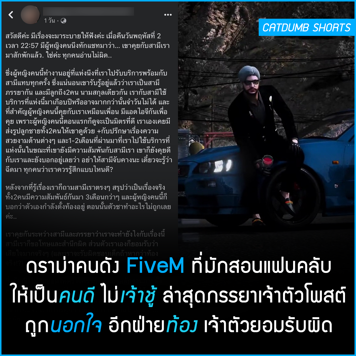 ดราม่า คนดัง FiveM ที่มักสอนคนในเกม ให้เป็นคนดี ไม่เจ้าชู้ ล่าสุดภรรยาเจ้าตัวโพสต์ ถูกนอกใจ อีกฝ่ายท้อง เจ้าตัวยอมรับ