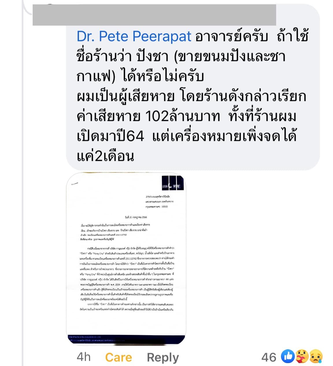 ล่าสุด "ดร.พีรภัทร ฝอยทอง" ทนายความชื่อดัง ได้โพสต์ผ่านเพจ Facebook 'Dr. Pete Peerapat' ต่อกรณีดังกล่าวว่า "พอดีมีคนแท็กมาถามว่า เขาเป็นผู้เสียหายถูกแจ้งให้ หยุดการใช้ชื่อร้านว่า #ปังชา และเรียกค่าเสียหาย 102 ล้านบาท แบบนี้เค้าใช้ชื่อร้านว่าปังชาได้หรือไม่"