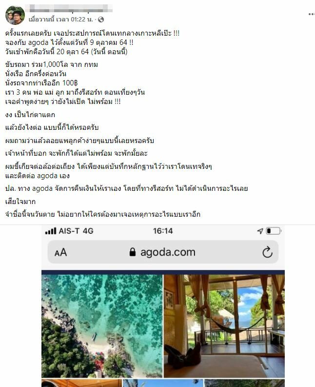 โดยสมาชิกเฟซบุ๊กรายหนึ่ง ซึ่งเดินทางไปไกลถึงเกาะหลีเป๊ะ ได้เล่าเรื่องราวลงใน กลุ่มเฟซบุ๊กเสพติดโรงแรม ว่า "ครั้งแรกเลยครับ เจอประสปการณ์โดนเทกลางเกาะหลีเป๊ะ !!! จองกับ agoda ไว้ตั้งแต่วันที่ 9 ตุลาคม 64 !! วันเข้าพักคือวันนี้ 20 ตุลา 64 (วันนี้ ตอนนี้)