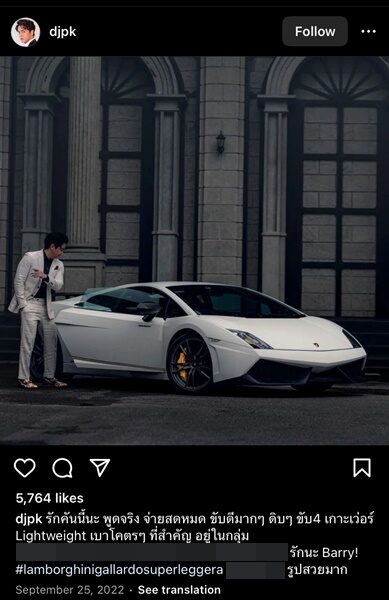 และนอกจากนี้ เป็นที่ฮือฮา ในโลกโซเชียลฯ เลยทีเดียว เมื่อหนุ่มพีเคเคยโพสต์ภาพโชว์รถหรูซูเปอร์คาร์"Lamborghini" รุ่น GALLARDO LP570-4 Superleggera คันสวยสีขาว ราคาเปิดตัวเหยียบ 30 ล้าน