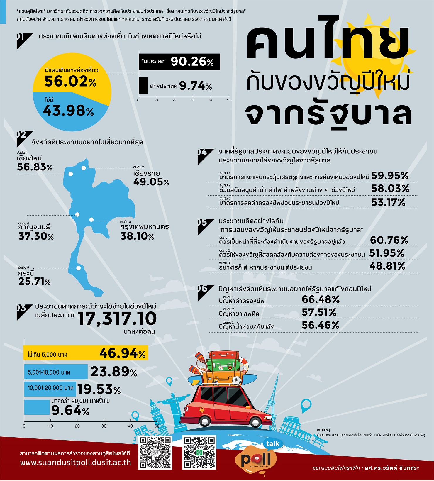 ผู้สื่อข่าวรายงานว่า สวนดุสิตโพล มหาวิทยาลัยสวนดุสิต สำรวจความคิดเห็นประชาชนทั่วประเทศ เรื่อง “คนไทยกับของขวัญปีใหม่จากรัฐบาล” กลุ่มตัวอย่าง จำนวน 1,246 คน (สำรวจทางออนไลน์และภาคสนาม) ระหว่างวันที่ 3-6 ธันวาคม 2567 พบว่า กลุ่มตัวอย่างมีแผนเดินทางท่องเที่ยวในช่วงเทศกาลปีใหม่ ร้อยละ 56.02 โดยเป็นแผนเที่ยวในประเทศ ร้อยละ 90.26 ต่างประเทศ ร้อยละ 9.74