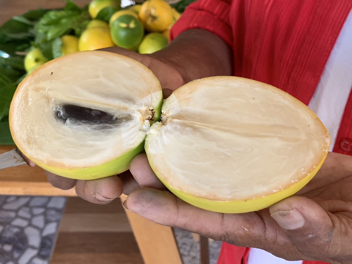ส่วนเมล็ดข้างในเป็นสีดำ ทรงยาวรีมีไม่เกิน 2 เมล็ด ขนาดลำต้นอายุ 3 ปีมีความสูงไม่เกิน 4-5 เมตร แตกพุ่มออกข้าง ทำให้เก็บเกี่ยวง่าย ดูแลง่าย ใช้ปุ๋ยอินทรีย์เช่น ขี้ไก่ ขี้วัว และแกลบเป็นหลัก เสริมด้วยดินภูเขาไฟเดือนละครั้ง จะให้ผลเร็ว ลูกใหญ่ ขนาด 3-5 ลูกต่อกิโล ที่สำคัญคือมีลูกดกตลอดทั้งปีไม่มีฤดูกาล ทำให้เกษตรกรเก็บขายได้อย่างต่อเนื่อง