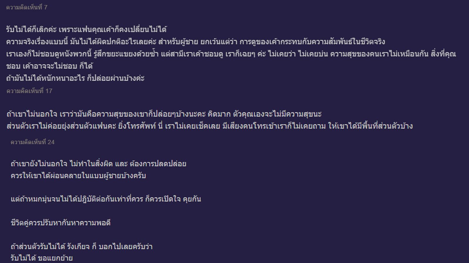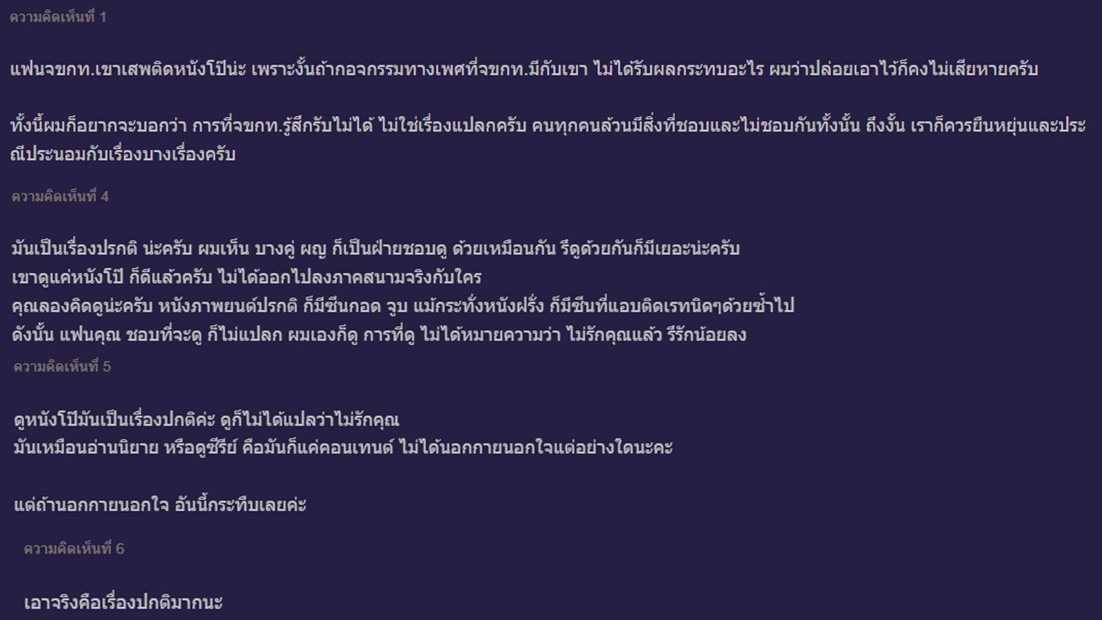 จากความคิดเห็นของชาวเน็ต ส่วนใหญ่มองว่าการดูหนังโป๊เป็นเรื่องปกติสำหรับผู้ชาย ถ้ายังไม่นอกกายและนอกใจหรือทำในสิ่งผิด นี่อาจเป็นเพียงความสุขหรือต้องการปลดปล่อยของแฟน
