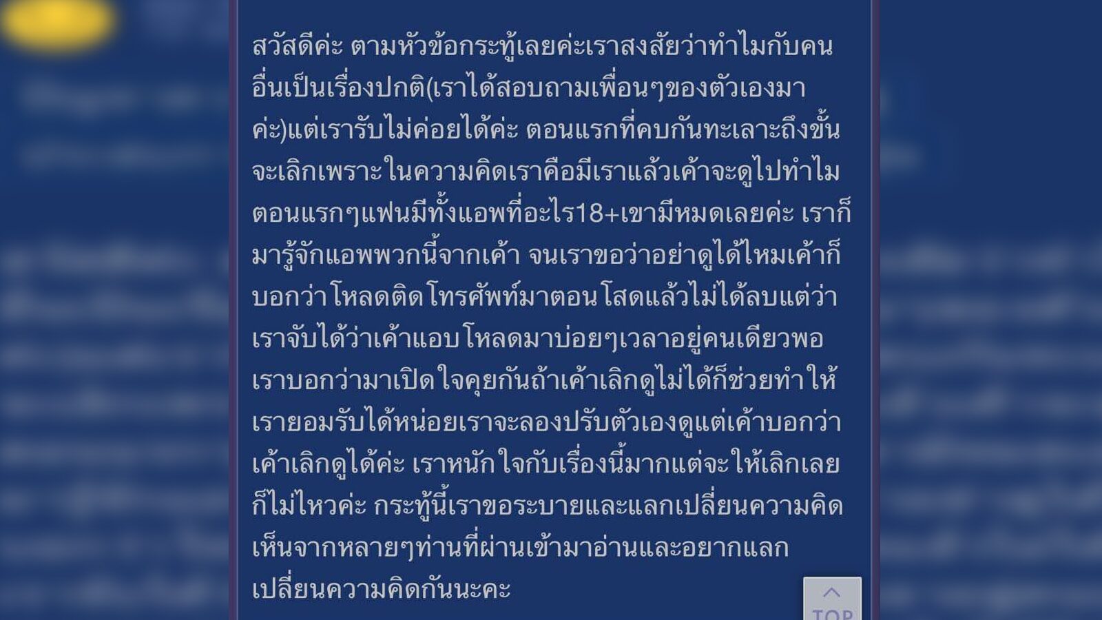 แม้ว่าแฟนจะรับปากว่าจะเลิก แต่เธอก็ยังรู้สึกหนักใจเรื่องนี้มาก แต่จะให้เลิกกับแฟนเลยก็ไม่ไหว เธอจึงมาตั้งกระทู้ระบาย และขอความคิดเห็นจากหลากหลายมุมมอง