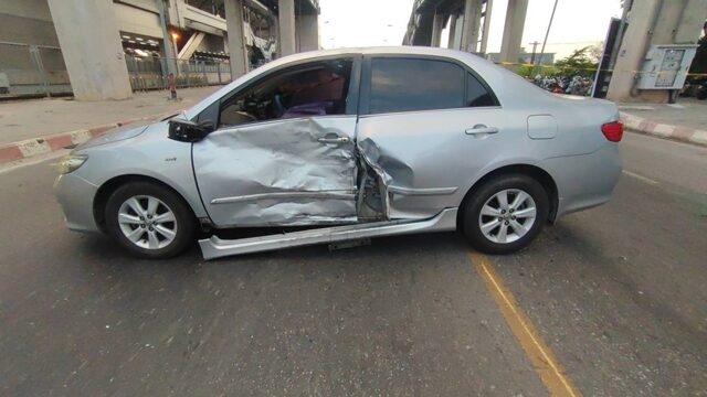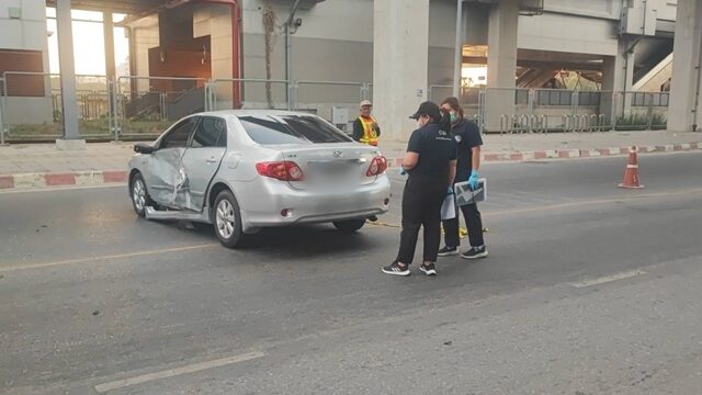 ห่างกันเล็กน้อยพบรถเก๋ง ยี่ห้อโตโยต้า ทะเบียน กรุงเทพมหานคร บริเวณประตูหน้าฝั่งซ้ายถูกชนได้รับความเสียหาย คนขับชื่อ นายอุดม (ขอสงวนนามสกุล) อายุ 39 ปี ยืนรอเจ้าหน้าที่ตำรวจอยู่ในที่เกิดเหตุ