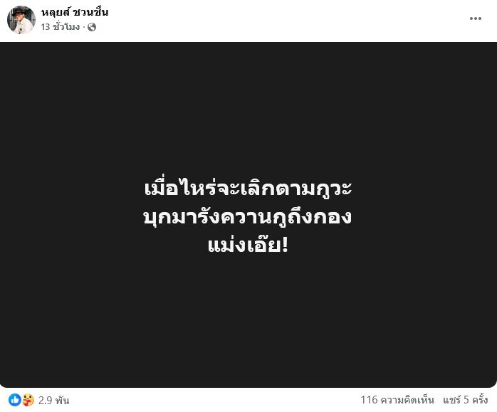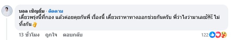 “เมื่อไหร่จะเลิกตามกูวะ บุกมารังควานกูถึงกอง แม่งเอ๊ย!” โดยเพื่อนตลกรุ่นน้อง บอล เชิญยิ้ม ก็เข้ามาคอมเมนต์ไม่ทิ้งกันด้วยว่า “เดี๋ยวพรุ่งนี้ที่กอง แล้วค่อยคุยกันพี่ เรื่องนี้ เดี๋ยวเราหาทางออกช่วยกันครับ พี่ว่าไงว่ามาเลย ไม่ทิ้งกัน”