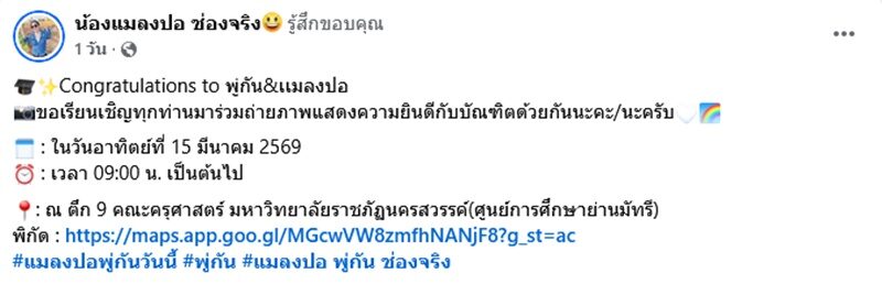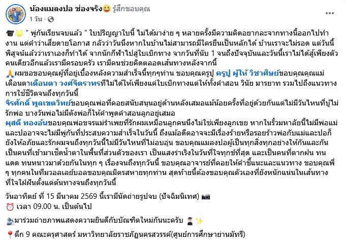“วันอาทิตย์ ที่ 15 มีนาคม 2569 นี้เรามีนัดถ่ายรูปจบ (ปัจฉิมนิเทศ) เวลา 09.00 น. เป็นต้นไป มาร่วมถ่ายภาพแสดงความยินดีกับบัณฑิตใหม่กันนะครับ