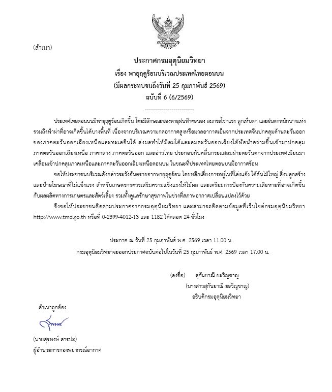 ประกาศ ณ วันที่ 25 กุมภาพันธ์ พ.ศ. 2569 เวลา 11.00 น. ทั้งนี้ กรมอุตุนิยมวิทยาจะออกประกาศฉบับต่อไปในวันที่ 25 กุมภาพันธ์ พ.ศ. 2569 เวลา 17.00 น.