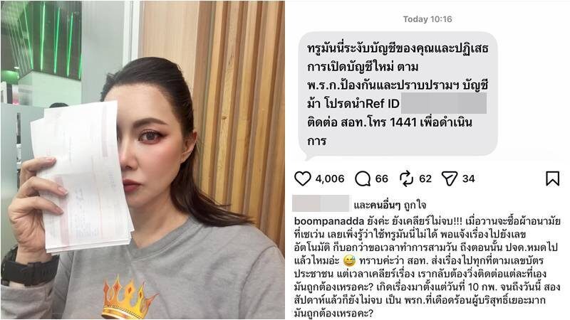 โดนหมดเลย? “ใช่ มันเกี่ยวกับเรื่องบัญชีม้าเมื่อวันนั้นแหละ ว่ามีคนแจ้งความ 3,800 บาท แล้วคุณอายัดทุกบัญชีบองบุ๋ม แล้วเวลาบล็อกคุณทำทีเดียวหมดทุกบัญชี แต่ตอนแก้ดิฉันต้องไปแก้ทีละที่ๆ เสียเวลามากเลย แล้วไม่ใช่ว่าแก้บัญชีม้าเทานะ ชื่อบัญชีคุณยังมีแบล็กลิสต์อยู่นะคะ”**