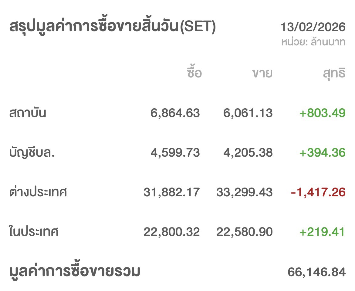 ผู้สื่อข่าวรายงานว่า ตลาดหุ้นไทยวันนี้ (13 กุมภาพันธ์ 2569) ดัชนี SET ปิดที่ระดับ 1,430.41 จุด ลดลง 11.12 จุด (-0.77%) มูลค่าการซื้อขายรวม 66,146.84 ล้านบาท แบ่งเป็นสถาบันในประเทศ ซื้อสุทธิ 803.49 ล้านบาท บัญชีบริษัทหลักทรัพย์ ซื้อสุทธิ 394.36 ล้านบาท นักลงทุนต่างประเทศ ขายสุทธิ 1,417.26 ล้านบาท และนักลงทุนทั่วไปในประเทศ ซื้อสุทธิ 219.41 ล้านบาท