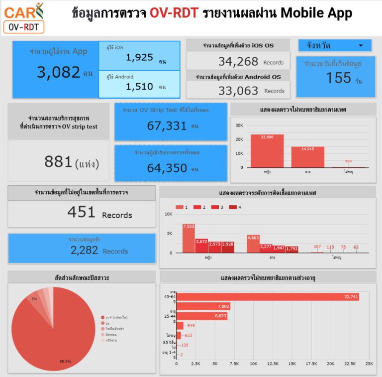 ซึ่งที่ผ่านมา วช. ได้ให้การสนับสนุนโครงการวิจัยท้าทายไทย : ประเทศไทยไร้พยาธิใบไม้ตับแก่สถาบันวิจัยมะเร็งท่อน้ำดี มหาวิทยาลัยขอนแก่น มาอย่างต่อเนื่อง ตั้งแต่ปี 2559 โดยโครงการวิจัยดังกล่าว ฯ ได้มีการพัฒนาผลงานวิจัยและนวัตกรรมที่เป็นประโยชน์ต่อการนำไปใช้ในการควบคุมโรคในพื้นที่จริง และได้มีการต่อยอดพัฒนาเทคโนโลยีอื่นๆ เพิ่มเติมเพื่อให้นวัตกรรมสามารถใช้งานได้อย่างมีประสิทธิภาพ อย่างเช่น การพัฒนาแพลตฟอร์มบนมือถือที่ช่วยสนับสนุนการทำงานของชุดตรวจคัดกรองพยาธิใบไม้ตับสำเร็จรูปชนิดเร็ว (OV-Rapid Diagnosis Test-OV-RDT) ที่ช่วยแก้ปัญหาการบริหารจัดการข้อมูลจากชุดตรวจอย่างเป็นระบบ สามารถนำไปวิเคราะห์ ติดตามผลทางระบาดวิทยา และพัฒนาเป็นฐานข้อมูลที่จะช่วยในวางแผนการบริหารจัดการเชิงกลยุทธ์ได้อย่างรวดเร็ว