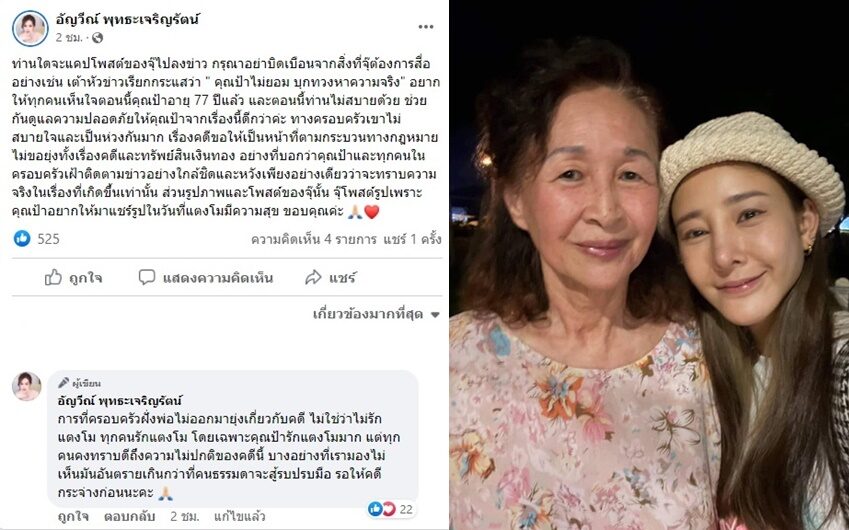 อย่างที่บอกว่าคุณป้าและทุกคนในครอบครัวเฝ้าติดตามข่าวอย่างใกล้ชิดและหวังเพียงอย่างเดียวว่าจะทราบความจริงในเรื่องที่เกิดขึ้นเท่านั้น** ส่วนรูปภาพและโพสต์ของจุ๊นั้น จุ๊โพสต์รูปเพราะคุณป้าอยากให้มาแชร์รูปในวันที่แตงโมมีความสุข ขอบคุณค่ะ