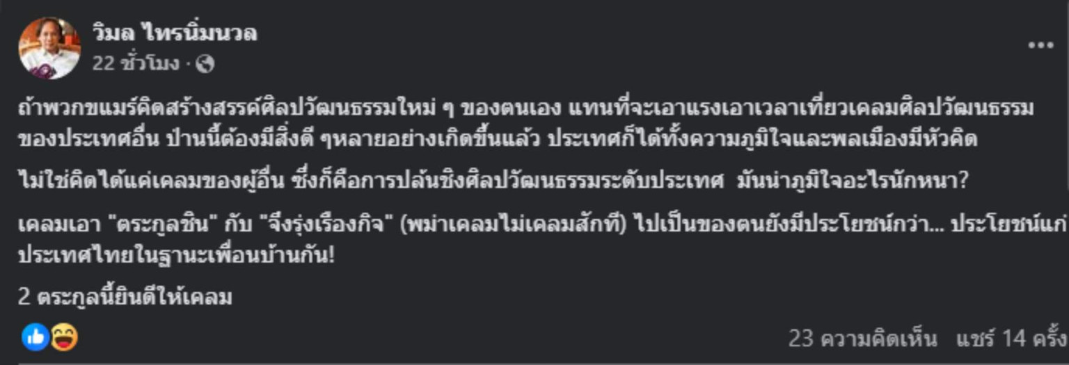 ไม่ใช่คิดได้แค่เคลมของผู้อื่น ซึ่งก็คือการปล้นชิงศิลปวัฒนธรรมระดับประเทศ มันน่าภูมิใจอะไรนักหนา?