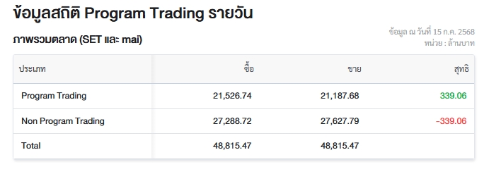 อัพเดต 15 ก.ค. 2568 เวลา 11.53 น. • เผยแพร่ 15 ก.ค. 2568 เวลา 11.53 น. • ข่าวหุ้นธุรกิจออนไลน์ผู้สื่อข่าวรายงานว่า วันนี้ (15 ก.ค.68) ตลาดหลักทรัพย์แห่งประเทศไทย (ตลท.) เปิดเผยข้อมูลซื้อขายรายวันผ่าน Program Trading หรือ “โปรแกรมโรบอทเทรดดิ้ง” มีมูลค่าซื้อจำนวน 21,526.74 ล้านบาท และมูลค่าขายจำนวน 21,187.68 ล้านบาท เท่ากับซื้อสุทธิ 339.06 ล้านบาท