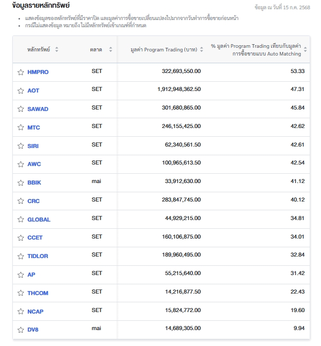 นอกจากนี้ ตลท.ยังรายงานข้อมูลหลักทรัพย์ที่ใช้ Program Trading ซื้อขายสูงสุด 15 อันดับ โดยเรียงจากเปอร์เซ็นต์ (%) มูลค่า Program Trading เทียบกับมูลค่าการซื้อขายแบบ Auto Matching ดังนี้ HMPRO, AOT, SAWAD, MTC, SIRI, AWC, BBIK, CRC, GLOBAL, CCET, TIDLOR, AP, THCOM, NCAP, DV8