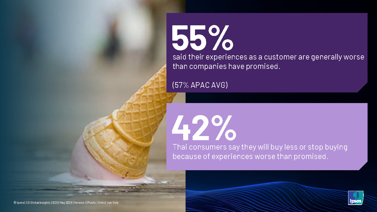 โดยพบว่า 73%ของผู้บริโภคชาวไทย เลือกแบรนด์จากประสบการณ์ (Customer Experience หรือ CX) และ 55%ของคนไทยรู้สึกว่าแบรนด์ต่าง ๆ ยังไม่สามารถส่งมอบประสบการณ์ได้ตามที่สัญญา ไว้ และ42%ระบุว่าจะ ลดหรือเลิกซื้อ ดังนั้น การลงมือทำตามคำมั่นสัญญาของแบรนด์ (Brand Promise) จึงเป็นสิ่งสำคัญมาก