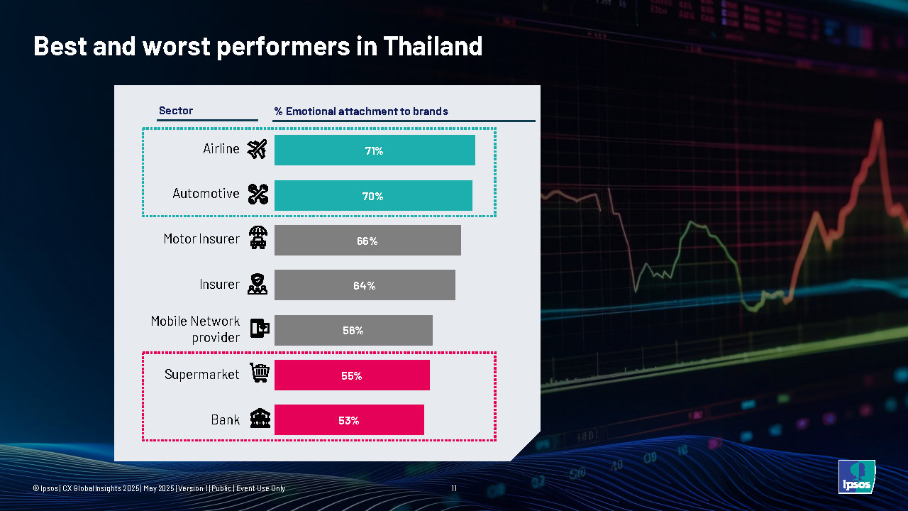 ในส่วนของความผูกพันกับแบรนด์พบว่า อุตสาหกรรมการบิน (71%) และยานยนต์ (70%) สามารถสร้างความผูกพันกับลูกค้าได้มากที่สุด ในขณะที่กลุ่มค้าปลีกซูเปอร์มาร์เก็ต (55%) และสถาบันการเงิน (53%) มีระดับความผูกพันน้อยที่สุด