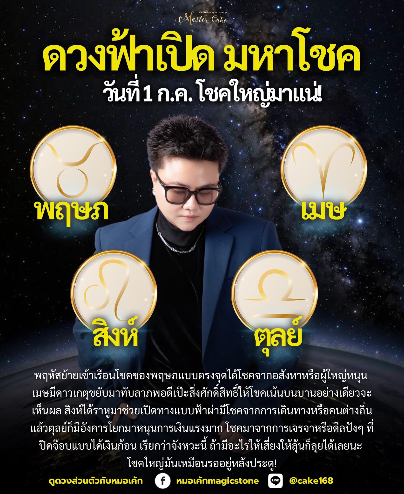 หมอเค้กMagic stone เผยถึงดวงชะตาราศี ดวงฟ้าเปิด มหาโชค วันที่ 1 ก.ค. โชคใหญ่มาแน่ โชคมาจากการเจรจาหรือดีลปังๆ ที่ปิดจ็อบแบบได้เงินก้อน เรียกว่าจังหวะนี้ ถ้ามีอะไรให้เสี่ยงให้ลุ้นก็ลุยได้เลย