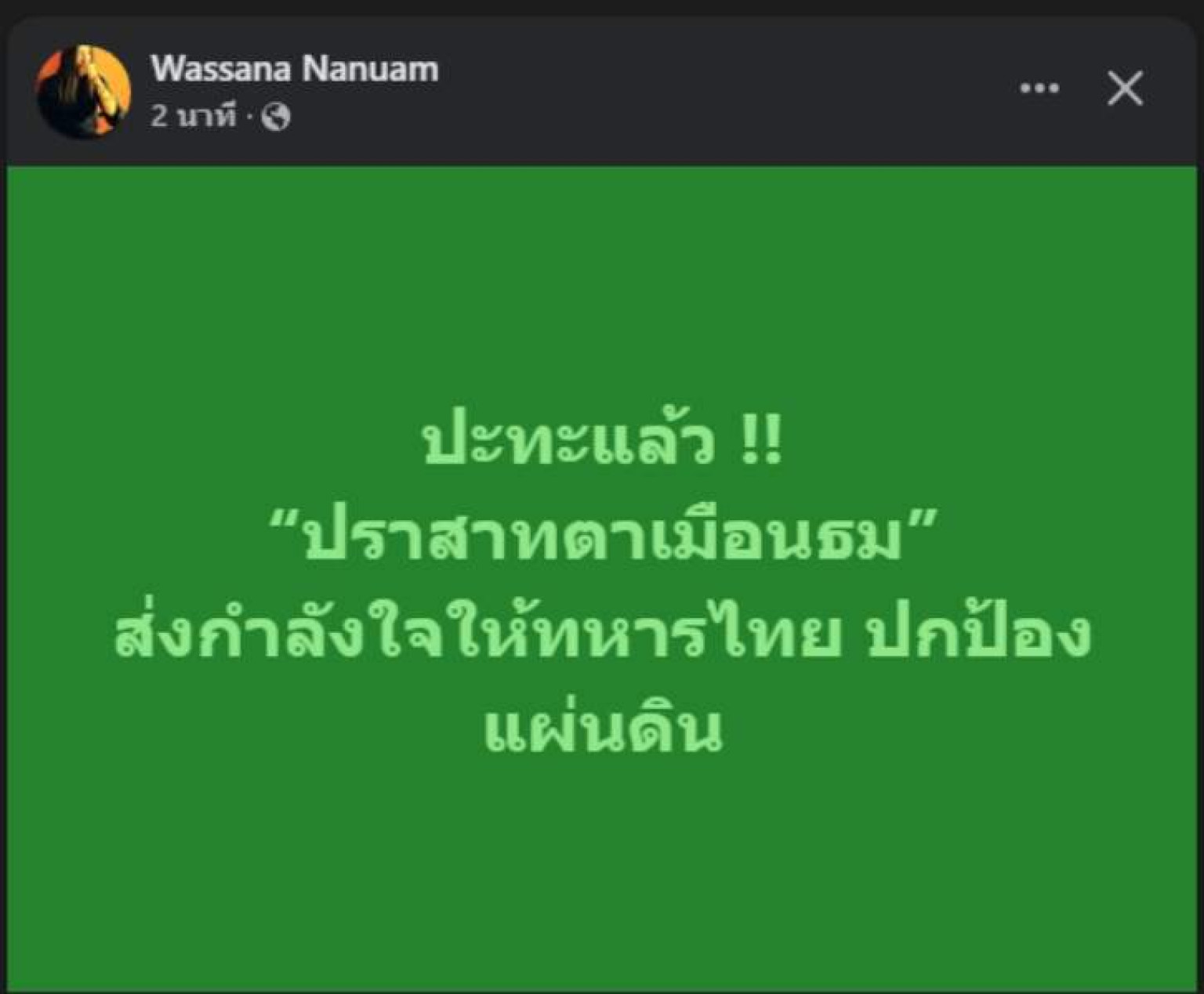 วันที่ 24 ก.ค.68 เวลา 08.45 น. “วาสนา นาน่วม” ผู้สื่อข่าวสายทหารชื่อดัง โพสต์ข้อความผ่านเฟชบุ๊ก Wassana Nanuam ระบุว่า… ปะทะแล้ว !! “ปราสาทต...