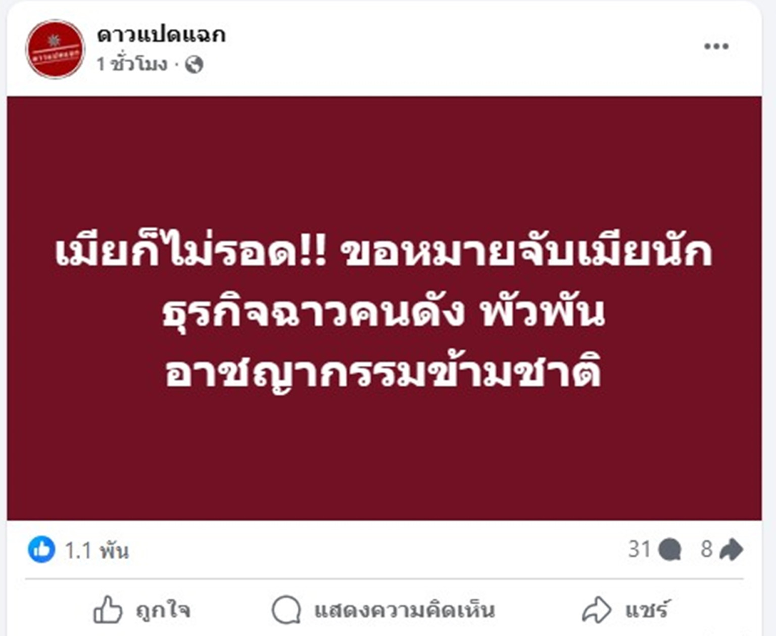 เมื่อวันที่ 23 ก.ค.68 เพจเฟซบุ๊ก "ดาวแปดแฉก" โพสต์ข้อความ ระบุว่า "เมียก็ไม่รอด!! ขอหมายจับเมียนักธุรกิจฉาวคนดัง ...