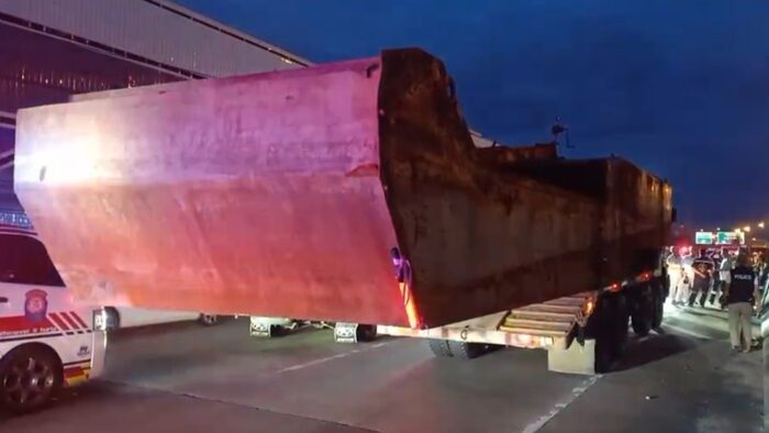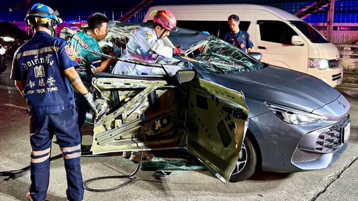 หนุ่มขับเก๋ง พุ่งเสยท้าย 12 ล้อบรรทุกโป๊ะเรือขุดน้ำหนัก 7 ตัน รถพังยับหลังคาเปิด เสียชีวิตคาที่ เพื่อนนั่งมาด้วยสาหัส เจ้าหน้าที่เร่งตรวจสอบหาสาเหตุ
