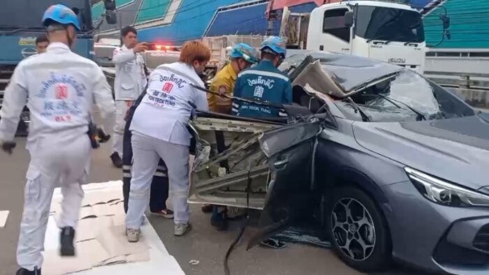เมื่อเวลา 05.30 น. วันที่ 21 มิ.ย.2568 พ.ต.ท.ยุทธนา พลอยสุก สารวัตร(สอบสวน) สน.บางเสาธง รับแจ้งเหตุรถยนต์พุ่งชนท้ายรถบรรทุกพื้นเลียบ 12 ล้อ บนถนนกาญจนาภิเษก ฝั่งขาออก มุ่งหน้าบางแค แขวงบางเชือกหนัง เขตตลิ่งชัน กทม. จึงรุดไปตรวจสอบพร้อมแพทย์ นิติเวช โรงพยาบาลศิริราช และอาสาสมัครมูลนิธิป่อเต็กตึ๊ง
