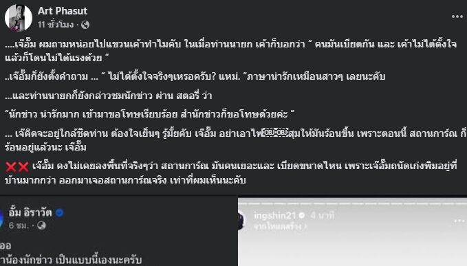ต่อมา อาร์ต พศุตม์ ได้แคปโพสต์ของ หมออั้ม พร้อมข้อความผ่านเฟซบุ๊กชื่อ Art Phasut โดยระบุว่า "เจ๊อั๊ม ผมถามหน่อยไปแขวนเค้าทำไมครับ ในเมื่อท่านนายก เค้าก็บอกว่า "คนมันเบียดกัน และ เค้าไม่ได้ตั้งใจ แล้วก็โดนไม่ได้แรงด้วย"