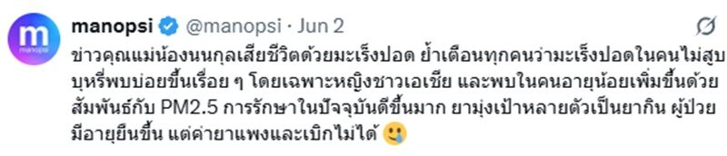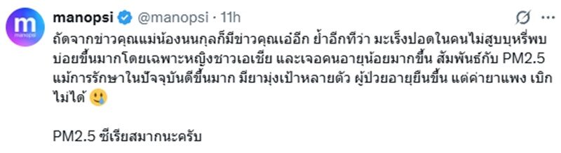 “ข่าวคุณแม่น้องนนกุลเสียชีวิตด้วยมะเร็งปอด ย้ำเตือนทุกคนว่ามะเร็งปอดในคนไม่สูบบุหรี่พบบ่อยขึ้นเรื่อย ๆ โดยเฉพาะหญิงชาวเอเชีย และพบในคนอายุน้อยเพิ่มขึ้นด้วย สัมพันธ์กับ PM2.5 การรักษาในปัจจุบันดีขึ้นมาก ยามุ่งเป้าหลายตัวเป็นยากิน ผู้ป่วยมีอายุยืนขึ้น แต่ค่ายาแพงและเบิกไม่ได้”