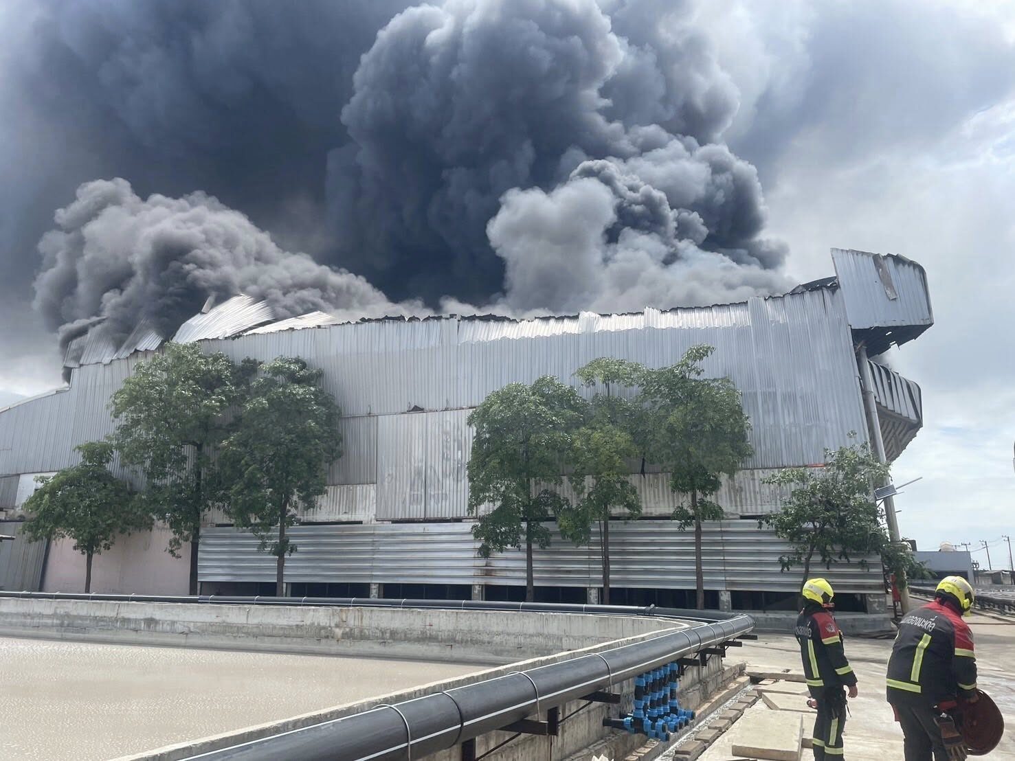 ลามไม่หยุด ไฟไหม้โรงงานสมุทรสาคร อาคารเริ่มทรุดตัว มีเสียงระเบิดเป็นระยะ แสงเพลิงลามไหม้เต็มพื้นที่ เจ้าหน้าที่ต้องประสานขอรถดับเพลิงจากพื้นที่ใกล้เคียงเข้ามาช่วยกันดับไฟ