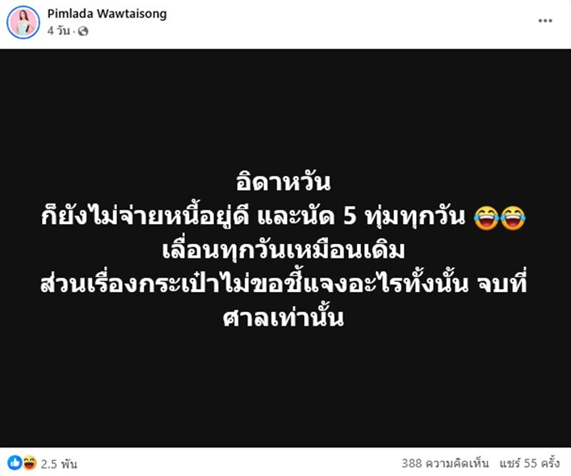 จากกรณี อินฟลูฯสาวคนดัง สอดอ เส้นด้าย โพสต์ข้อความว่า “อิดาหวัน ก็ยังไม่จ่ายหนี้อยู่ดี และนัด 5 ทุ่มทุกวัน เลื่อนทุกวันเหมือนเดิม ส่วนเรื่องกระเป๋าไม่ขอชี้แจงอะไรทั้งนั้น จบที่ศาลเท่านั้น”