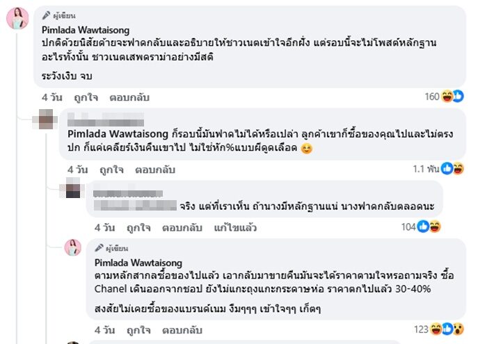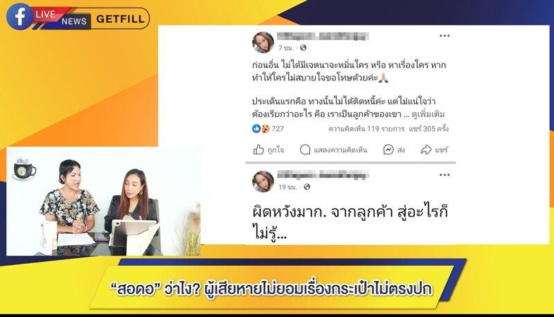 “ลูกค้าคนนี้เป็นแฟนคลับมาก่อน ตอนนี้มาเป็นคู่กรณี ก็บอกว่ากระเป๋าที่ส่งมาขายต่อไม่ได้ สอดอ อาจจะคิดว่าตัวเองไม่ได้ผิด 100 เปอร์เซ็นต์ เพราะไม่ได้รับรู้เรื่อง แล้วก็หายไปนานแล้ว มาติดต่อผ่านทีมงาน แล้วทีมงานคนนั้นก็ลาออกไปแล้ว ไลฟ์ในติ๊กต็อกก็ไมได้ไลฟ์อะไรแล้ว มาหาเรื่อง ก็ลืมจริง ทำไมไม่ทักมาทางเพจ มาปล่อยให้ยาวนานไป ไม่รักไม่พอ ยังเอามาประจานอีก ก็เจอกันที่ชั้นศาล เอาไปหมิ่นประมาท จะเอา PDPA ด้วยเลย ”