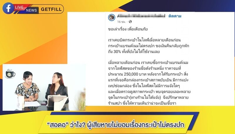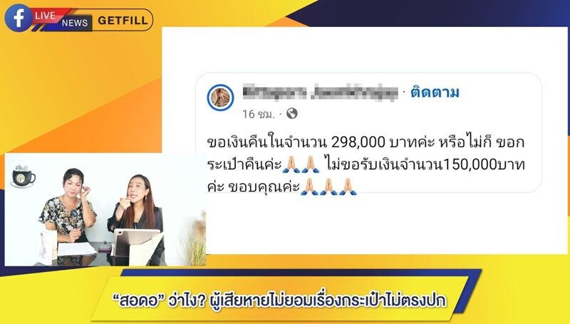 “จากลูกค้า ก็เลยจะขอเงิน 2.98 แสน คืนได้ไหม หรือเอากระเป๋าใบนั้นมาคืนได้ไหม ไม่ขอรับเงิน 1.5 แสน ด้าน สอดอ ก็บอกว่า ราคามันไม่ได้ เหมือนหมดความนิยม เพราะผ่านมา 7 เดือน แต่ผู้เสียหายก็ไม่ยอม ”