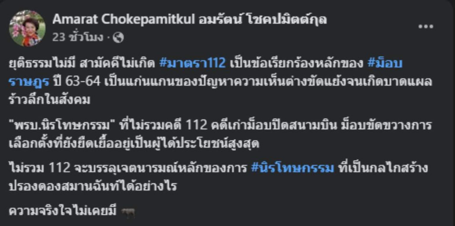 วันที่ 1 ก.ค. 68 อมรัตน์ โชคปมิตต์กุล อดีตแกนนำพรรคก้าวไกล นักเคลื่อนไหวทางการเมือง โพสต์ข้อความผ่านเฟซบุ๊ก