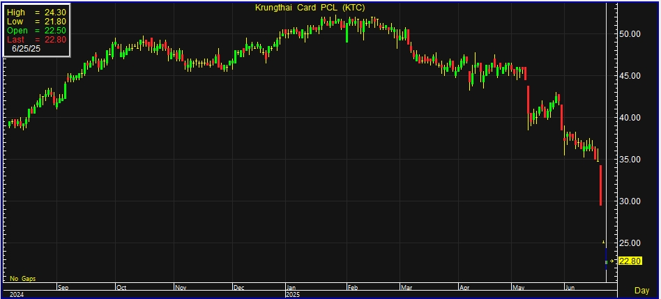 โดยราคาหุ้น KTC ยังคงปรับตัวลดลงต่อเนื่อง แม้แรงขายเริ่มชะลอตัวลงเล็กน้อย หลังจากที่ราคาหุ้นได้ปรับตัวลงแตะระดับต่ำสุดของวัน (ราคาฟลอร์) ติดต่อกัน 2 วันทำการช่วงวันที่ 23-24 มิ.ย. 68 ที่ผ่านมา