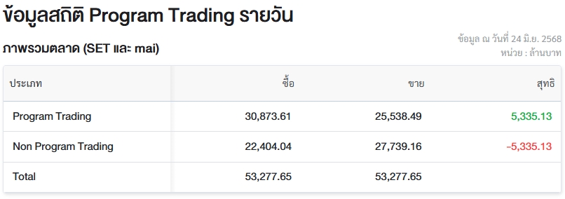 อัพเดต 24 มิ.ย. 2568 เวลา 13.40 น. • เผยแพร่ 24 มิ.ย. 2568 เวลา 13.40 น. • ข่าวหุ้นธุรกิจออนไลน์ผู้สื่อข่าวรายงานว่า วันนี้ (24 มิ.ย.68) ตลาดหลักทรัพย์แห่งประเทศไทย (ตลท.) เปิดเผยข้อมูลซื้อขายรายวันผ่าน Program Trading หรือ “โปรแกรมโรบอทเทรดดิ้ง” มีมูลค่าซื้อจำนวน 30,873.61 ล้านบาท และมูลค่าขายจำนวน 25,538.49 ล้านบาท เท่ากับซื้อสุทธิ 5,335.13 ล้านบาท