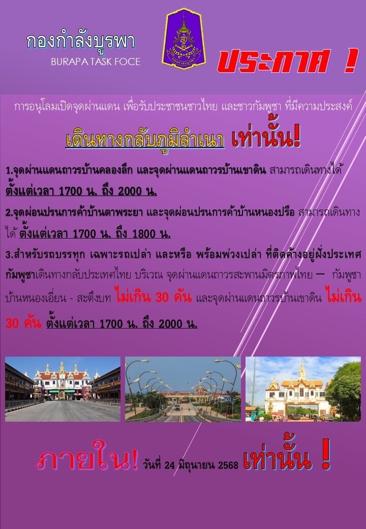 วันที่ 24 มิ.ย. 2568 กองกำลังบูรพา ออกประกาศเรื่องการอนุโลมเปิดผ่านแดนเพื่อรับประชาชนชาวไทย และชาวกัมพูชาที่มีความประสงค์เดินทางกลับภูมิลำเนาเท่านั้น ได้แก่