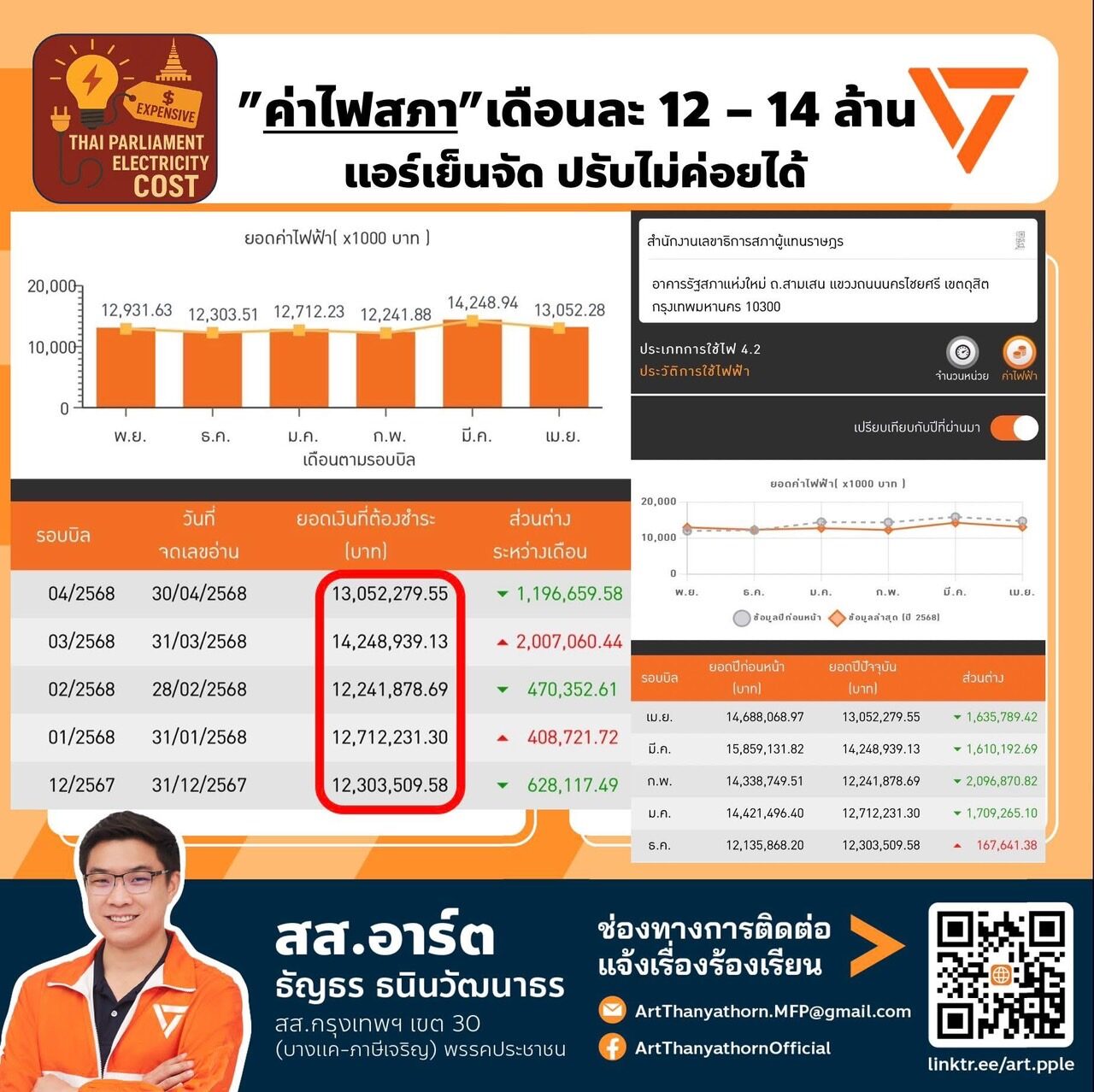 ขณะที่ก่อนหน้านี้นายธัญธร ธนินวัฒนากร สส.กทม.พรรคประชาชน ออกมาเปิดเผยตัวเลขค่าไฟของรัฐสภา ซึ่งตกเดือนละ 12-14 ล้านบาท โดยระบุว่าการใช้ไฟฟ้าของรัฐสภามีปัญหา ตั้งแต่เรื่องแอร์เย็นจัด ปรับไม่ค่อยได้ ในขณะที่คนไทยต้องประหยัดไฟ ปรับแอร์ขึ้น 1 องศา หรือลดเวลาเปิดเครื่องใช้ไฟฟ้า เพราะค่าไฟในแต่ละเดือนไม่ต่างจากภาระผูกพันหนักอึ้ง