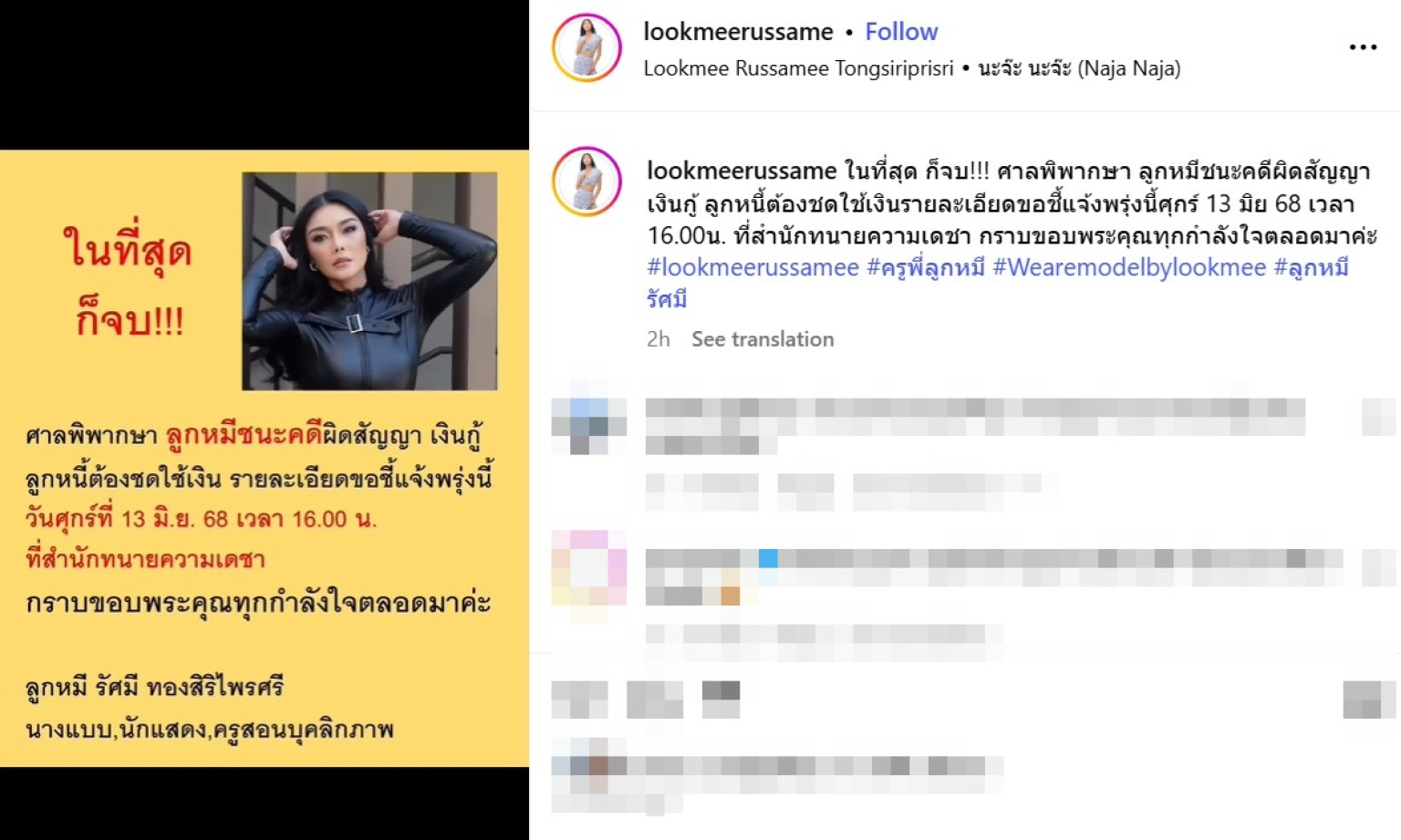 ในที่สุดดราม่าผิดสัญญาเงินกู้ของนักแสดง-นางแบบสาว "ลูกหมี รัศมี" ได้ข้อยุติแล้ว เมื่อเจ้าตัวออกมาประกาศผ่านอินสตาแกรม พร้อมร่อนหมายเชิญสื่อแจ้งข่าวดีว่า "ในที่สุด… ก็จบ!!! ศาลพิพากษา ลูกหมีชนะคดีผิดสัญญาเงินกู้ ลูกหนี้ต้องชดใช้เงิน รายละเอียดขอชี้แจ้งพรุ่งนี้ ศุกร์ 13 มิ.ย. 68 เวลา 16.00 น. ที่สำนักทนายความเดชา" พร้อมทั้งกล่าวขอบคุณทุกกำลังใจที่ได้รับมาตลอด