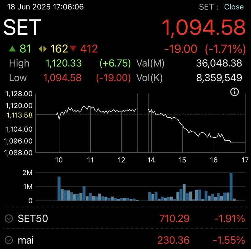 วันที่ 18 มิ.ย.68 บริษัทหลักทรัพย์ กรุงศรี จำกัด (มหาชน) รายงานสรุปภาวะตลาดหุ้นไทย (SET Index) วันนี้ ปิดตลาดปรับลดลง 19.0 จุด (-1.71%) ปิดที่ 1,094.58 จุด มูลค่าการซื้อขาย เบาบางที่ 3.60 หมื่นล้านบาท