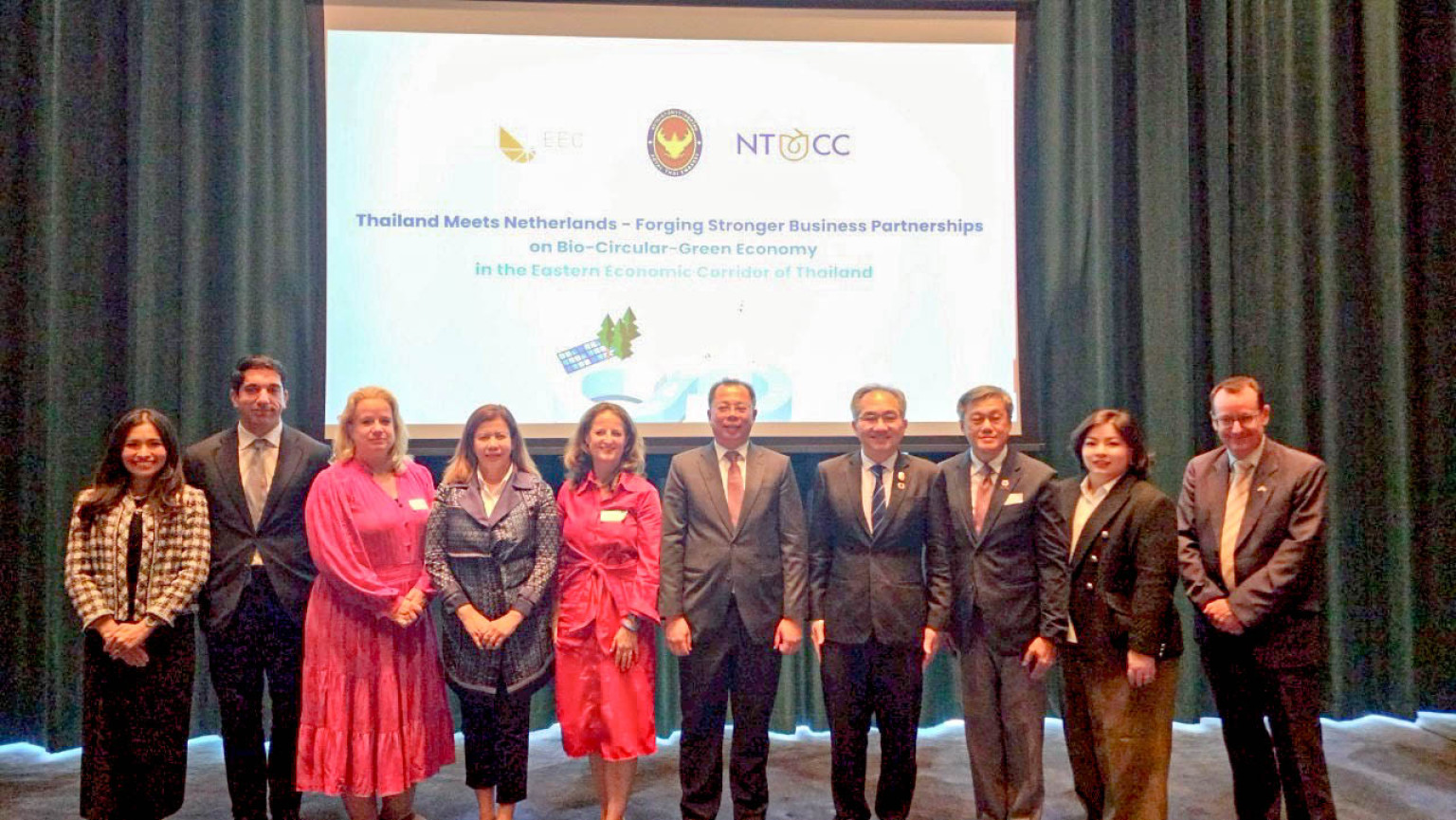 สำหรับการเดินทางเยือนประเทศเนเธอร์แลนด์ครั้งนี้ สกพอ. ยังได้จัดกิจกรรมสัมมนาเชิงธุรกิจในหัวข้อ “Thailand Meets Netherlands: Forging Stronger Business Partnerships on Bio-Circular-Green Economy in the Eastern Economic Corridor of Thailand” ณ กรุงอัมสเตอร์ดัม ร่วมกับหอการค้าเนเธอร์แลนด์ – ไทย (Netherlands – Thai Chamber of Commerce: NTCC) และสถานเอกอัครราชทูตไทย ณ กรุงเฮก โดยมีผู้แทนจากหน่วยงานภาครัฐไทย และภาคเอกชนเนเธอร์แลนด์ที่ประกอบธุรกิจในพื้นที่อีอีซีเข้าร่วมเป็นวิทยากร อาทิ ศาสตราจารย์ ดร.ชูกิจ ลิมปิจำนงค์ ผู้อำนวยการ สวทช. นำเสนอโอกาสความร่วมมือด้านการวิจัยและพัฒนา และโอกาสในการลงทุนในพื้นที่ EECi นางสาวนลินี กาญจนามัย รองผู้ว่าการ (บริหาร) กนอ. นำเสนอพื้นที่นิคมอุตสาหกรรมสีเขียวเพื่อรองรับการลงทุนในอนาคต ดร. ชลจิต วรวังโส วีรกุล ผู้ช่วยเลขาธิการ สกพอ. นำเสนอโอกาสการลงทุนในอุตสาหกรรมเศรษฐกิจ BCG และภาคเอกชนไทยและเนเธอร์แลนด์ร่วมนำเสนอประสบการณ์การลงทุนในพื้นที่อีอีซีและประเทศไทย โดยงานสัมมนาดังกล่าวได้รับความสนใจจากภาครัฐและภาคเอกชนเนเธอร์แลนด์ เข้าร่วมงานมากกว่า 70 ราย