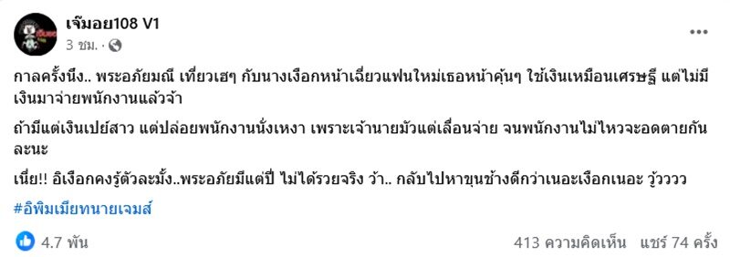 แฉ พระอภัยมณี เที่ยวเฮกับนางเงือกหน้าเฉี่ยวแฟนใหม่เธอหน้าคุ้นๆ ทำตัวเศรษฐีแต่ไม่มีเงินจ่ายพนักงาน