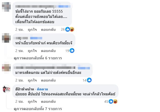 ชาวเผือกคอมเมนต์กันรัวๆ อยากรู้มากว่าใคร หลายคนบอกสอบตกแล้ว อาทิ หน้าเฉี่ยวกับหน้าเก๋ คนเดียวกันมั้ยเจ๊ , ใครอี๊กกกกกกก โอ๊ย , ขุนช้างคือใครอ่อ , วันนี้ยากมาก ขอลอกคร๊าา , สอบตกตั้งแต่ยังไม่เข้าห้องสอบ เป็นต้น
