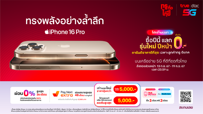ครั้งแรกในประเทศไทย!!!! กับโปร iPhone ที่ดีที่สุดเพื่อลูกค้าทรู ดีแทค กับโปรสุดล้ำ แบบข้ามเวลา เพียงซื้อ iPhone 16 รุ่นใดก็ได้ (iPhone 16, iPhone 16 Plus, iPhone 16 Pro, iPhone 16 Pro Max) พร้อม สมัครแพ็กเกจรายเดือนตั้งแต่ 1,299 ขึ้นไป สัญญา 12 เดือน เมื่อครบสัญญา รับสิทธิ์นำ iPhone 16 รุ่นที่ซื้อมาแลกซื้อเป็น iPhone รุ่นใหม่ ราคาเริ่มต้น 0 บาท เมื่อได้รับการตรวจสอบประเมินสภาพเครื่องเกรด A (โดย iPhone รุ่นใหม่ต้องมีมูลค่าเท่ากันกับ iPhone 16 รุ่นที่นำมาแลก กรณี iPhone รุ่นใหม่มีมูลค่าสูงกว่า iPhone 16 รุ่นที่นำมาแลก ลูกค้าต้องชำระส่วนต่าง)
