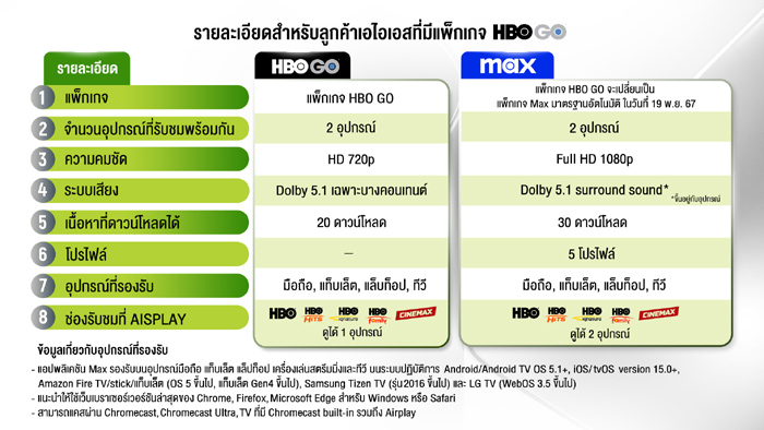 ตั้งแต่วันที่ 19 พฤศจิกายน 2567 เป็นต้นไป สิทธิ์การใช้งาน HBO GO ของลูกค้า AIS จะเปลี่ยนเป็นสิทธิ์การใช้งาน แพ็กเกจ Max มาตรฐาน (Max Standard) ลูกค้าจะได้รับประสบการณ์การสตรีมที่เหนือระดับบน Max ด้วยอินเทอร์เฟซที่ใช้งานง่าย รวมถึงคำแนะนำรายการส่วนบุคคล การค้นหาที่ราบรื่น หมวดหมู่ตามประเภทรายการ และศูนย์รวมแบรนด์ แพ็กเกจมาตรฐานของ Max รองรับการสตรีมพร้อมกันบนอุปกรณ์สองเครื่องในครั้งเดียว และสามารถรับชมบนอุปกรณ์ที่หลากหลายขึ้นรวมถึงทีวี นอกจากนี้ลูกค้ายังสามารถดาวน์โหลดคอนเทนต์ได้สูงสุดถึง 30 รายการเพื่อรับชมได้ทุกที่ทุกเวลา