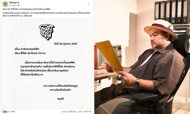 วันที่ 28 ต.ค.67 เพจ โคตรคูล โพสต์ จดหมายถึงโอ๊ต ปราโมทย์ “เรื่อง ลาพักยกออฟฟิศ เนื่องจากงานล้นทะลักมาทั้งปี พวกเราทั้งออฟฟิศเลยขอลาพักยกแก๊ง! ขอยื่นใบลาให้พี่โอ๊ต พักหนีงานไปชาร์จพลังกันสักหน่อย เดี๋ยวกลับมาลุยใหม่! พี่โอ๊ต อย่าลืมพักนะ ”