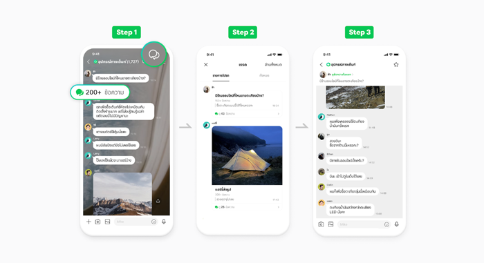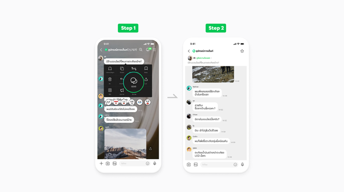 วิธีดูเธรด:เลือกไอคอนเธรดบนมุมขวาบนหน้าห้องโอเพนแชทหลัก หรือ ไอคอนด้านล่างข้อความนั้นๆ เพื่อไปหน้ารวมเธรด