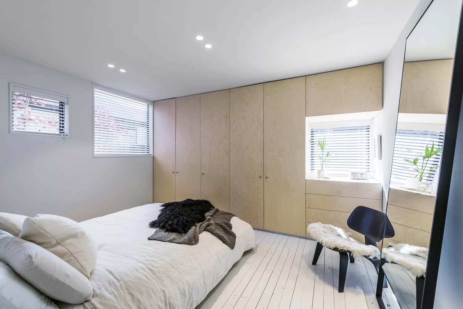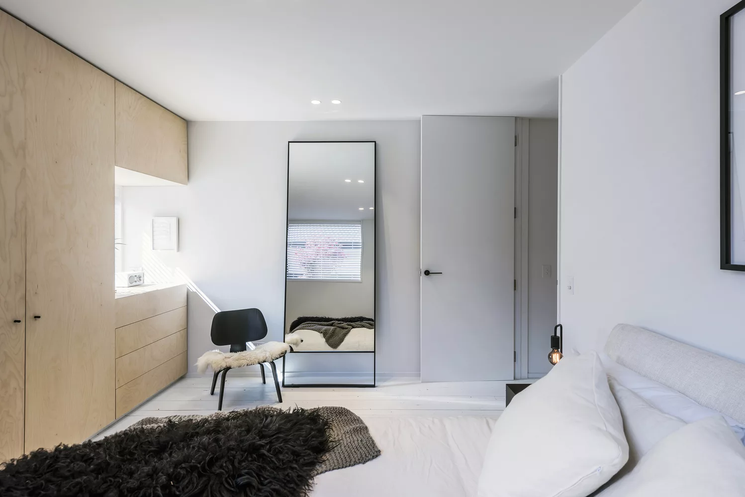 ตัวบ้านภายนอกใช้ไม้กันฝนสีดำเข้มมาตกแต่งเป็นกำแพง พื้นไม้รีไซเคิล ตัดกับการตกแต่งภายในสีขาวสว่าง เฟอร์นิเจอร์หลายชิ้นทำจากไม้อัด รวมถึงฉากกั้นห้องเก็บของที่ช่วยประหยัดพื้นที่ระหว่างพื้นที่นั่งเล่นกับโถงทางเข้าหลักของบ้าน บรรยากาศภายในบ้านปลอดโปร่ง อากาศถ่ายเทได้ดี นอกจากนี้เฟอร์นิเจอร์โดยรวมยังคุมโทนสีดำ สีขาว สีน้ำตาล ซึ่งให้ความรู้สึกที่ทันสมัย และอบอุ่นเป็นอย่างมาก เป็นการออกแบบที่เรียบง่าย แถมพื้นที่ใช้สอยภายในก็กว้างขวางสะดวกสบายอีกด้วย