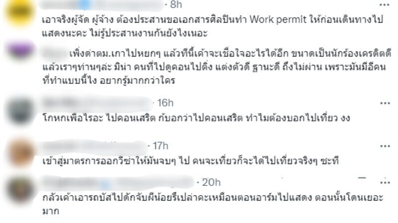 "ก็คือไปแบบจ้างงาน มันต้องเสียภาษี ต้องทำเอกสารยุ่งยากกทเลยลักไก่กันเอาแบบเนี้ย ไปละรอดก็โอเคไป โดนจับได้คือจบ ไม่ได้ไปงาน งานต้องยกเลิก เผลอๆ โดนปรับ ไหนจะโดนแบล็คลิส ได้ไม่คุ้มเสีย ไม่คิดกันเลย" , "ขอวีซ่าผิดประเภทป่าว ผจก.ก็มักง่ายเกิน"