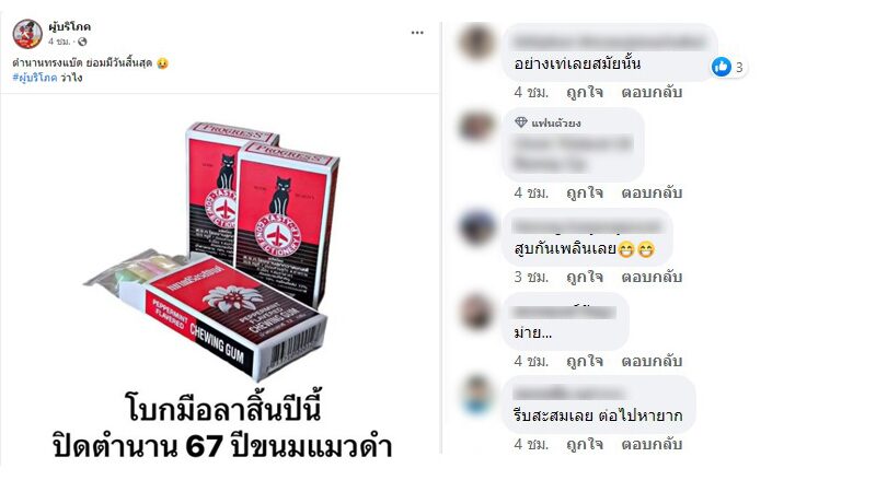 โดยในภาพ คือ "ขนมแมวดำ" หรือ"หมากฝรั่งแมวดำ" พร้อมข้อความที่เขียนว่า"โบกมือลาสิ้นปีนี้ ปิดตำนาน 67 ปี ขนมแมวดำ"