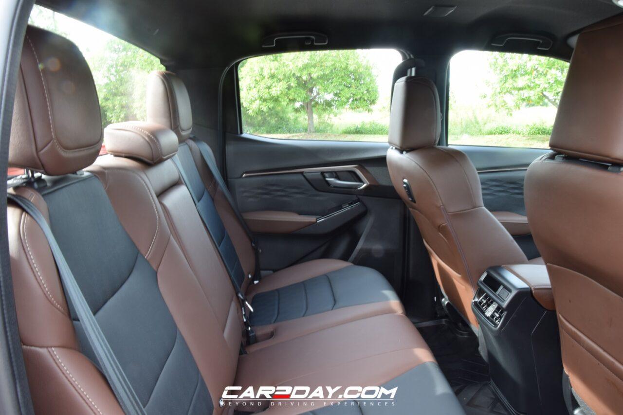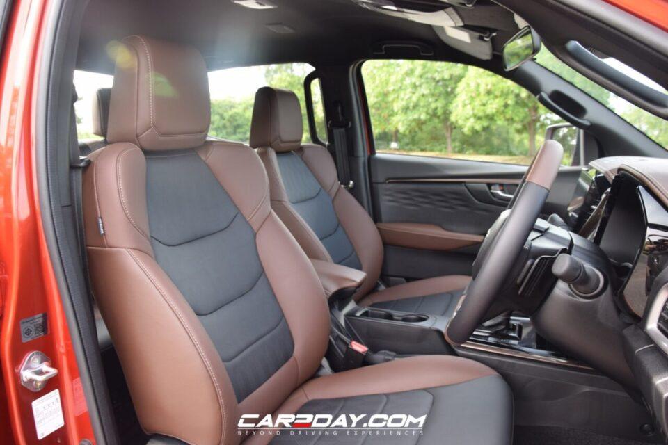 เบาะคู่หน้าสีน้ำตาลกับสีดำเดินด้ายสีขาวลวดลายใหม่ด้านคนขับปรับไฟฟ้า 8 ทิศทาง ส่วนคนนั่งปรับ 4 ทิศทางธรรมดา มี COOLMAX ช่วยลดการสะสมความร้อนในตัวเบาะ สามารถซับแรงสั่นสะเทือนลดความเมื่อยล้ากับเทคโนโลยี AVEC (Anti Vibration Elastic Comfort) นั่งสบายรื่นรมย์ในการเดินทางเรียกว่าเป็นปิกอัพอันดับต้นๆของไทยที่ใส่ใจในเรื่องความสบายรองรับสรีระคนขับคนนั่งได้ทุกรูปแบบเสียดายน่าจะมีระบบดันหลังมาให้จะวิเศษขึ้นกว่านี้ เบาะนั่งด้านหลังหุ้มหนังแบบเดียวกับด้านหน้าโดยพับได้ทั้งส่วนตัวเบาะและที่รองนั่งแบบ 60/40 สามารถวางของได้รองรับที่นั่งเด็ก ISOFIX ด้วยขึ้นลงสะดวกด้วยราวจับถึง 8 จุด